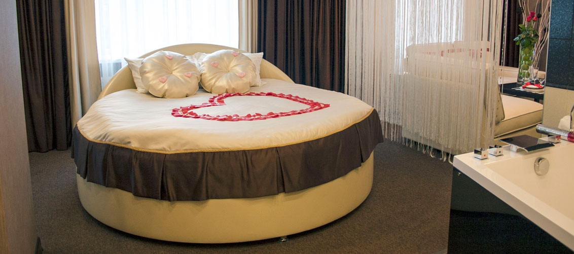 Испытайте роскошь со всем комфортом! Номер "Люкс" оснащен большой круглой двуспальной кроватью. В гостиничном номере, помимо круглой кровати, есть еще дополнительные и приятные составляющие - джакузи с подсветкой в спальне и гигантское зеркало напротив кровати.