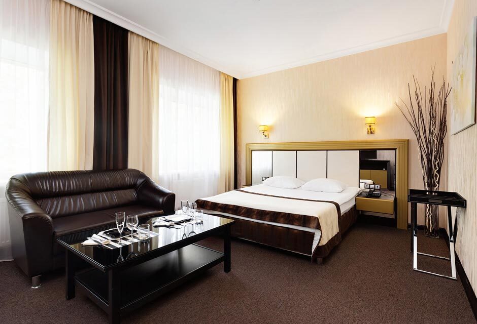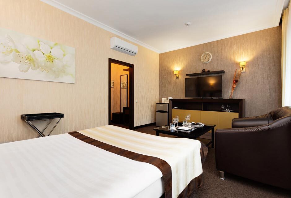 В номере: большая кровать, диван, увеличенная площадь номера, кондиционер, бесплатный WI-FI, телефон, чайник, набор для чаепития (чай, кофе, сахар), SMART-TV, санузел, оригинальная душевая кабина из стекла, выложенная мозаикой, махровые халаты, одноразовые тапочки. Удобная парковка на территории отеля.