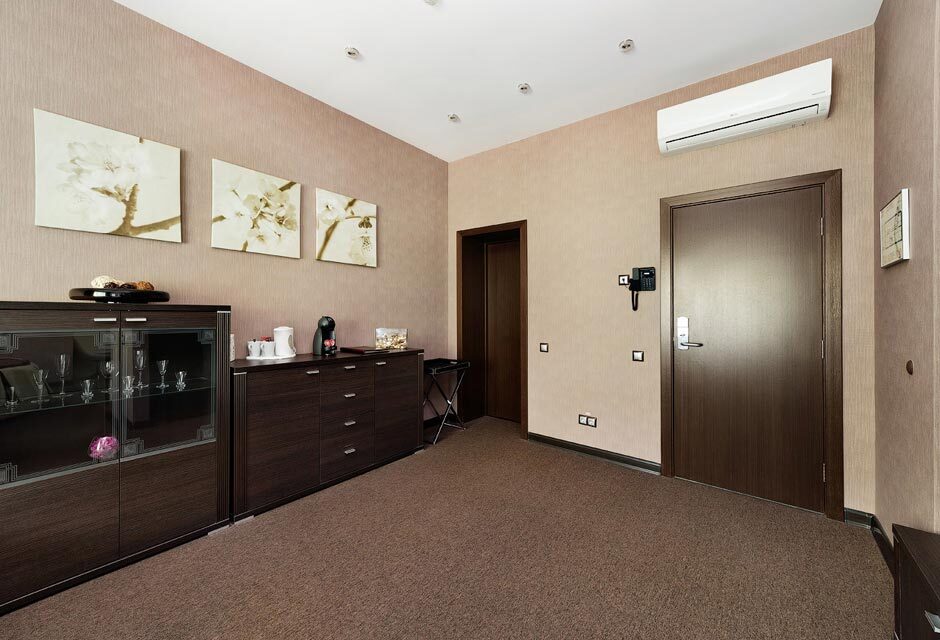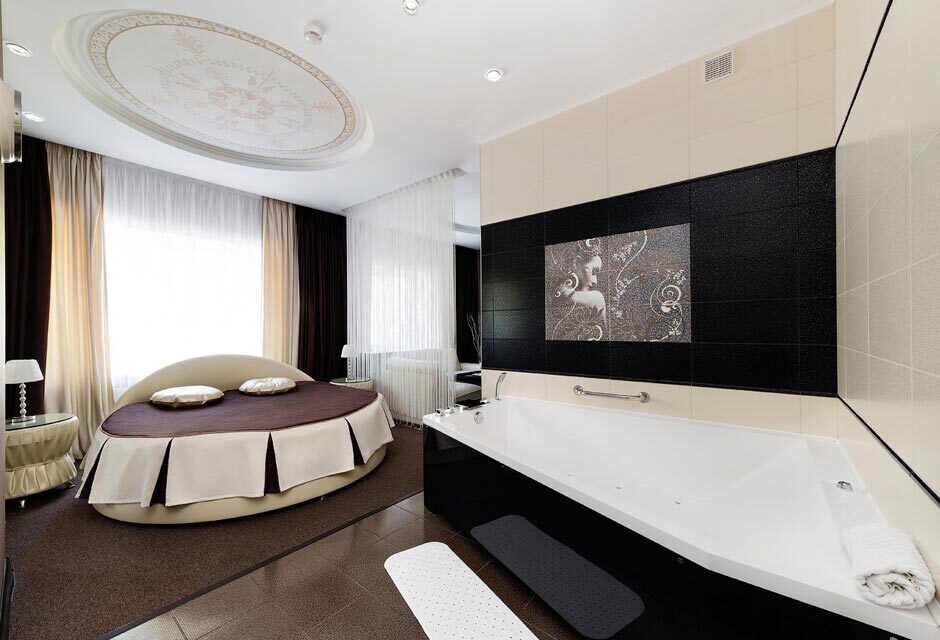 В номере: 2 комнаты с раздвижной шторой, круглая большая кровать, диваны, джакузи, барный столик, кондиционер, бесплатный WI-FI, телефон, чайник, набор для чаепития (чай, кофе, сахар), SMART-TV, санузел, оригинальная душевая кабина из стекла, выложенная мозаикой, махровые халаты, одноразовые тапочки. Удобная парковка на территории отеля.